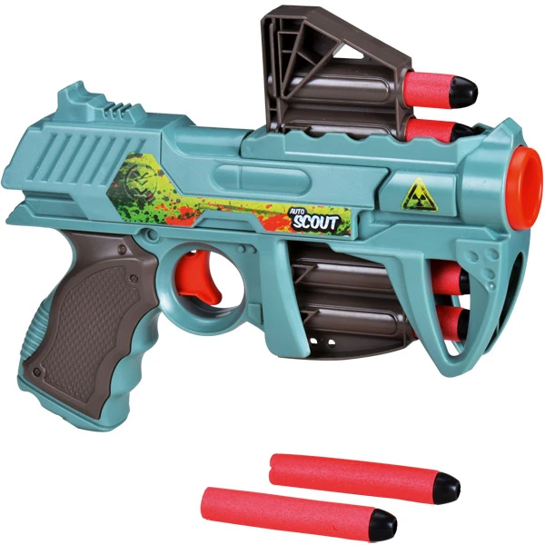 The Auto Scout is a 2013 Lanard Huntsman blaster that holds 6 Clip Darts. Unlike the Jaguar where its clip cannot be removed, the Auto Scout's clip is removable. It uses a clip similar to the ones used by the Auto Tek 20 and Cougar. It retails for EUR6.99, and can only be found in the UK. It advertizes a range of 25 feet.