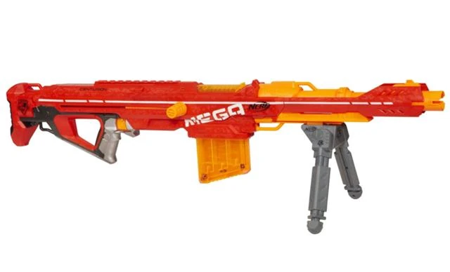 The Centurion (codenamed the Javelin) is a N-Strike Elite Mega series weapon that can hold up to 6 Elite Mega Darts. It is designed to be a long-range sniping blaster. It is part of the new Elite Mega series, has an overall length of 42", and fires up to 100 feet, although most of the time shots will drop significantly below the maximum distance. It uses Elite Mega Darts, which are held in new MCS 6-Dart Clips. Its average retail is $49.99. It is the spiritual successor to the Longshot CS-6, but also has some resemblance to the Stampede ECS, especially the handle of the blaster.