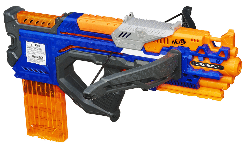 The Crossbolt is a 2015 Nerf N-Strike Elite blaster that holds 12 Elite Darts in a bullpup fashion. The blaster seems to be a RapidStrike CS-18 fused with a Crossfire Bow and a Rayven CS-18. Very little is known about the blaster, given the hints shown in the image, although what is known is that its two bow limbs serve no function. It seems to have a jam door like the Stryfe, which could signify that it probably has the same restrictions as the Stryfe; that there is no stock attachment point, and that there only seems to be on tactical rail located under the barrel. It is said to be equipped with Elite XD performance, and is advertised to shoot up to 90 feet. It was shown on amazon.com.uk in November 2014 and publicly shown off by Hasbro on November 20, 2014.