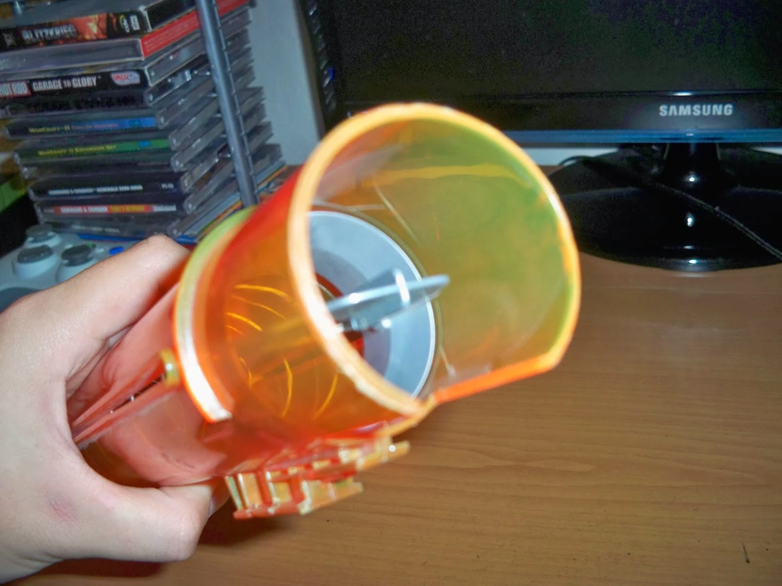 The Cyclotron Stick Magazine is a special type of clip that holds 6 Ballistic Balls, introduced in 2003. As the name suggests, this is a ball-holding device for the Cyclotron. Because of this, it is only compatible with said blaster. It is inserted via a circular port on the back of the blaster. There is a small spring-loaded guide inside to hold the balls. However, there is no lip to hold the balls down as they are being pushed into the clip, so if one takes their hand off the balls as they are trying to load another ball into the clip, all the balls will fly out, making one effectively look for the balls again and reload the clip. Due to its patron blaster having a short lifespan, it is no longer sold.