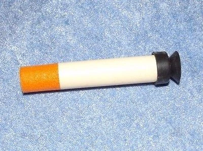 The Mega Glow Dart was the dart type included with the Electric Eel. It was a Mega Dart with red foam and a black suction cup head, both of which didn't glow. The dart had to wrapped in a glow-in-the-dark sticker that contained the phosphor. This sticker covered approximately 3/4 of the length of the dart. Each dart was charged by the Electric Eel's flash (similar to a camera flash) as it was fired.
