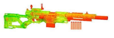 The Longstrike CS-6 (Sonic) is a Nerf Sonic Series blaster that holds 18 Streamline Darts. It is essentially a Longstrike CS-6 redone with better range and a clear plastic casing with a green coloring. It is no longer available for purchase as the Sonic Series line is no longer available for purchase. It was a Toys 'R' Us exclusive.