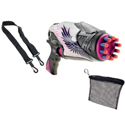 The Powerbelle is a 2013 Nerf Rebelle blaster that can hold up to 10 Collectible Darts, first revealed on Argos.co.uk in July. It is a redesigned Speedswarm, but has a claimed range of 75 feet. The Powerbelle has upgraded internals. Like the Speedswarm, it runs on 6 AA batteries, but comes with a sling and an ammo pouch, something that the Speedswarm did not have. It is a Walmart exclusive in the US.