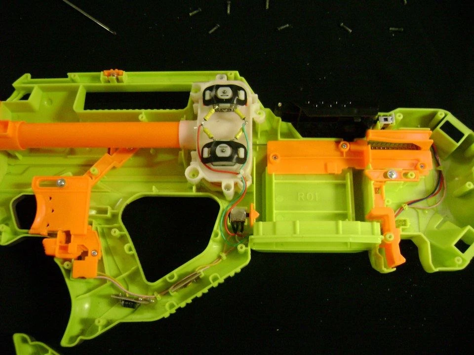 The internals of the Rayven CS-18 are a little bit sub-standard for a blaster with flywheels, as the Rayven is of the bullpup type. It has a firing trigger, acceleration trigger, barrel, electrical wires, pistons, two vertical flywheels and a dart pusher.