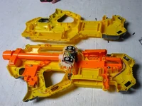 The internals of the Rayven Stinger are a little bit sub-standard for a blaster with flywheels, as the Rayven is of the bullpup type. It has a firing trigger, acceleration trigger, barrel, electrical wires, pistons, two vertical flywheels and a dart pusher.