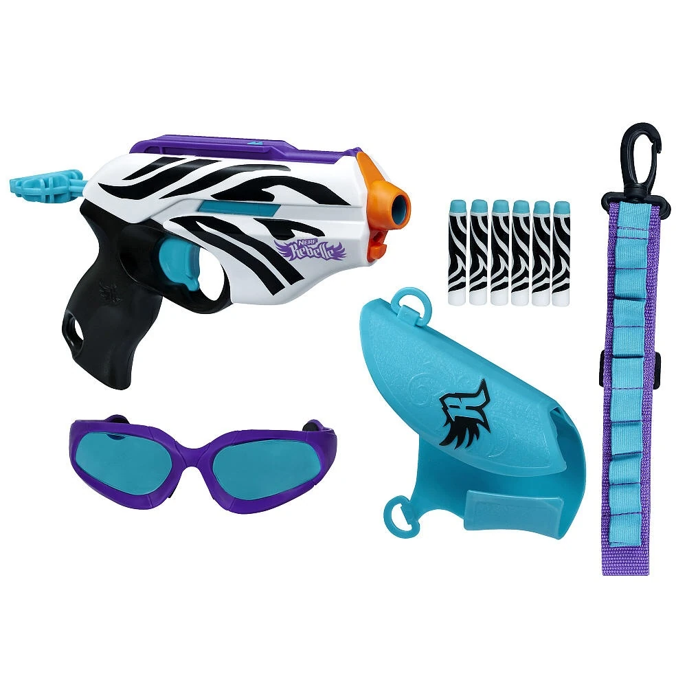 The Wild Glam is a 2014 Nerf Rebelle Super Stripes blaster that holds 1 Collectible Dart. The blaster is an exact copy of the Rebelle Pink Crush, minus the bow limbs. The blaster bears the standard white paintjob and black striping like with all other blasters in the line. Like the Sweet Revenge, it comes with a lot of accessories. The Wild Glam comes packaged with six Collectible Darts, a belt clip, a holster and Vision Gear glasses. The blaster costs $19.99 and has a 75 foot range. It is a Toys 'R Us exclusive.